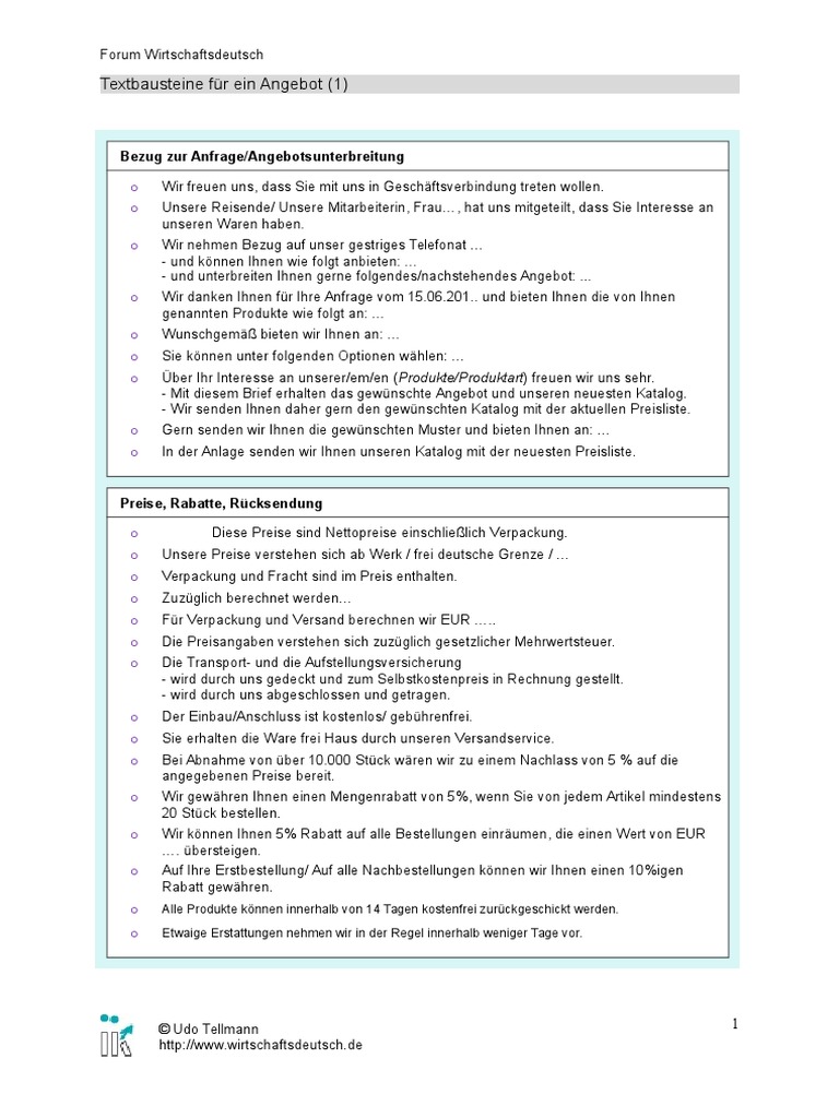 Forum wirtschaftsdeutsch udo tellmann httpwwwwirtschaftsdeutschde 1 textbausteine für eine anfrage 1 einleitung o wir verdanken ihre anschrift der firma xy. Forum wirtschaftsdeutsch udo tellmann httpwwwwirtschaftsdeutschde 3 textbausteine für ein angebot 3 liefer und zahlungsbedingungen.